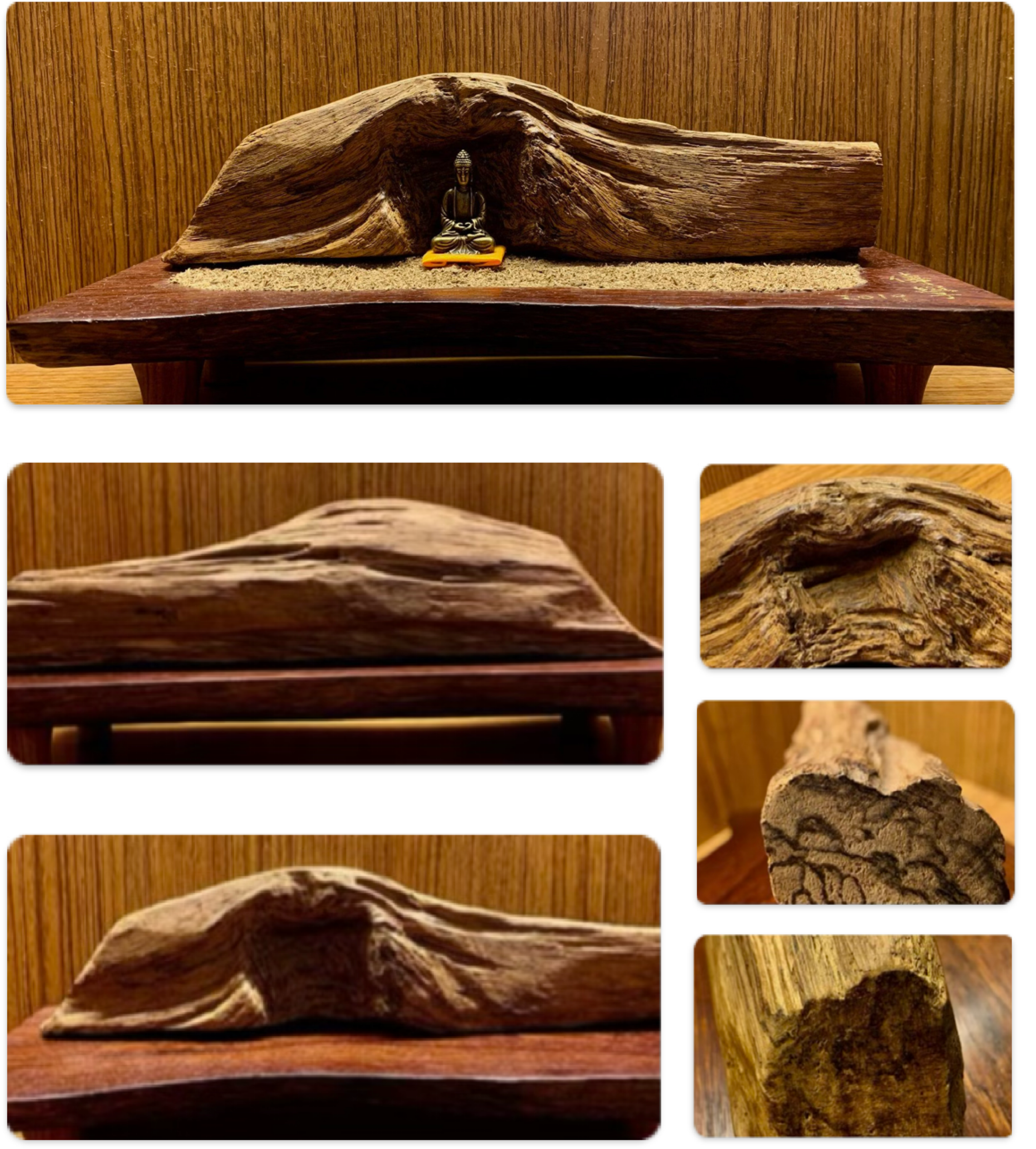 這件沉香創作,使用的是星洲系產區汶萊土沉香,落款是寫個人皈依法名傳學,佛像底部的黃布是當年去在印度正覺塔也就是佛陀悟道的地方,穿在佛陀身上的袈裟請回來的,象徵土壤的部分是用惠安系各產區野生沉香粗粒舖底,整體看起來像是佛在石窟前靜坐的意境。