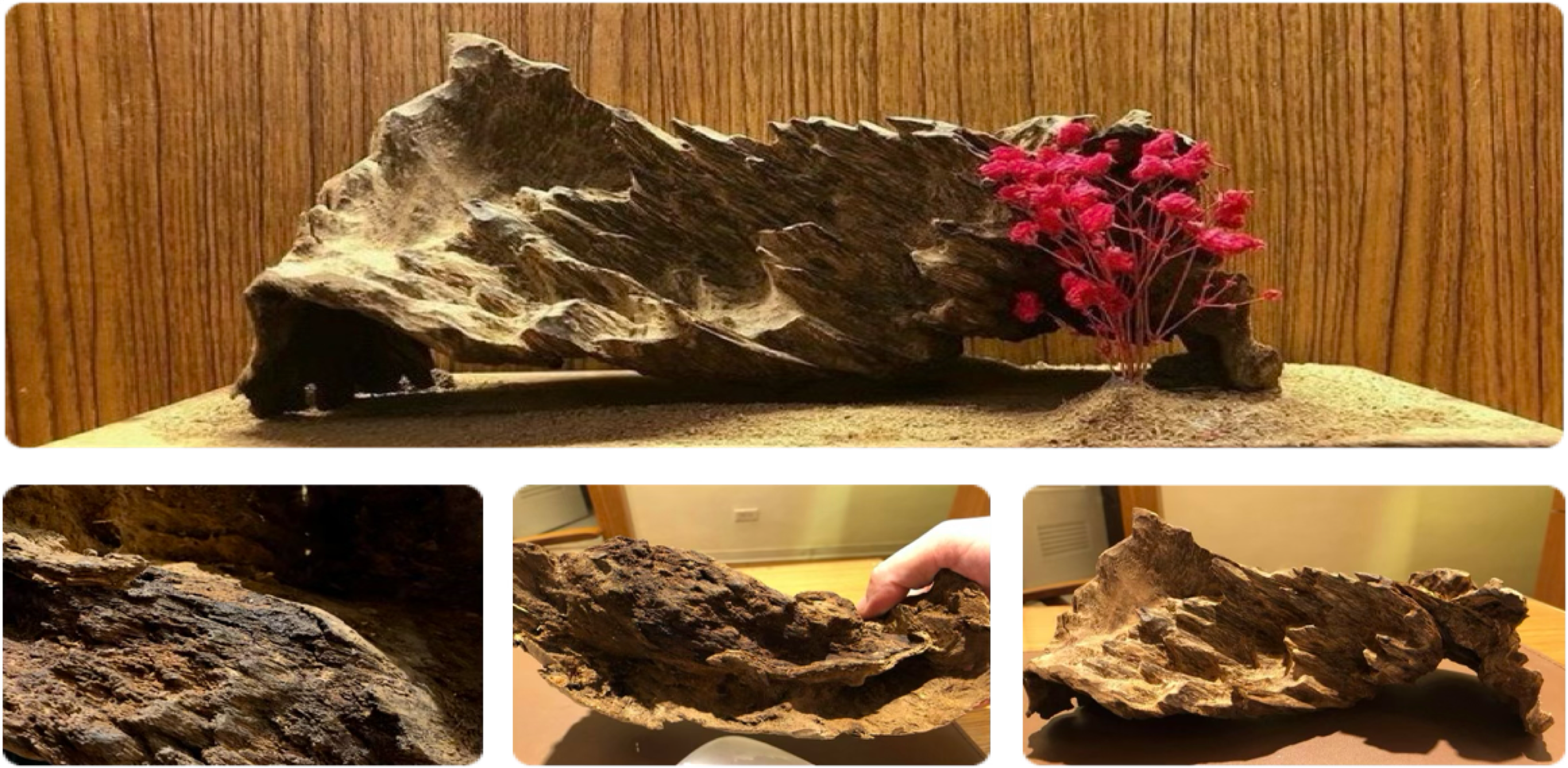 這件個人沉香創作,名為(秋紅)這沉香型態如高山峻嶺一般並帶著一種強烈蕭瑟與落寞感,前方放了一株盛開而艷麗的紅花,讓這件作品產生了繁華與落寞極大對比,也成為了可以細細品味,其中橫絲又直絲的扭曲變形的線條,原自大自然的創作 "雷擊" 沉香,受傷來自閃電,而整棵樹未死,經長時間慢慢修復傷口而結香,因受到強烈電擊而使這顆沉香樹在後續生長時而變型,可說是歷經大死而重生,使這件沉香擁有與眾不同的外型,讓這件來自越南的頂級產區的富森及其香味的一流,讓這件秋紅沉香創作變成稀有中藝術作品!